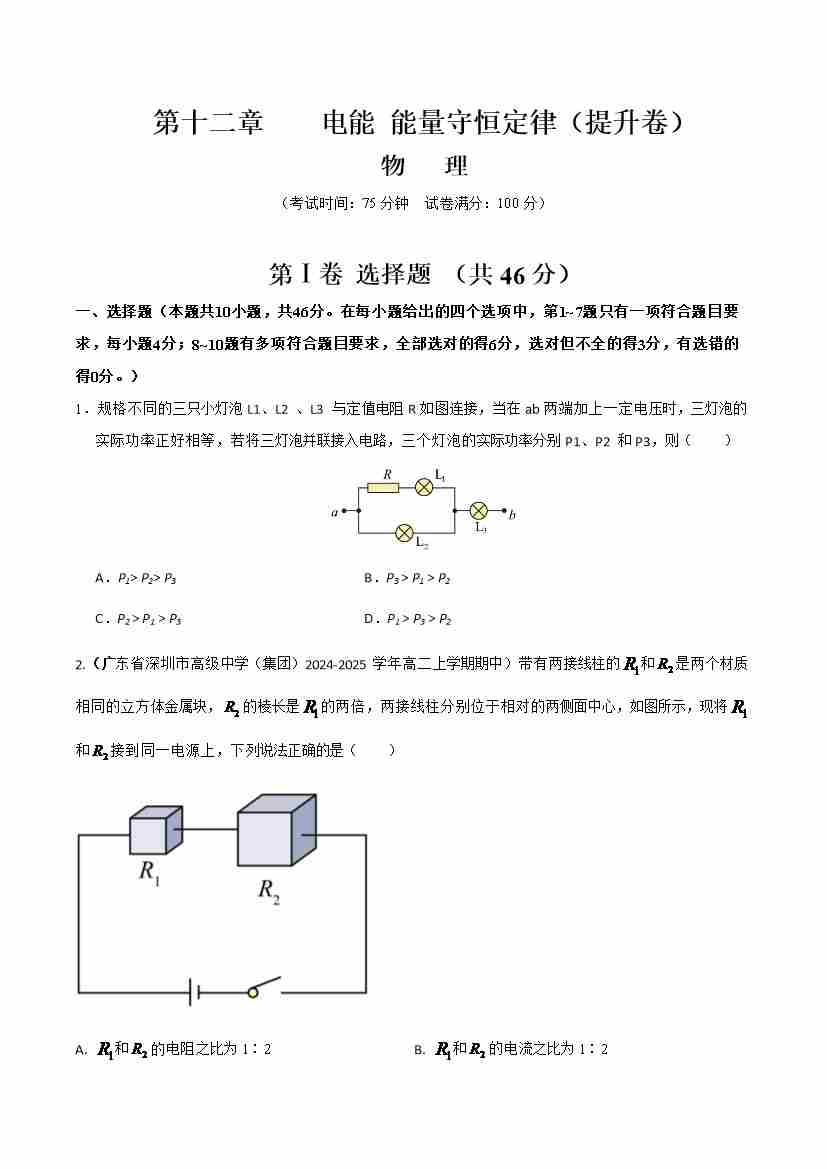 首页 > 全部 > 举一反三 > 第十二章 电能 能量守恒定律(举一反三单元测试·提升卷)(学生版)