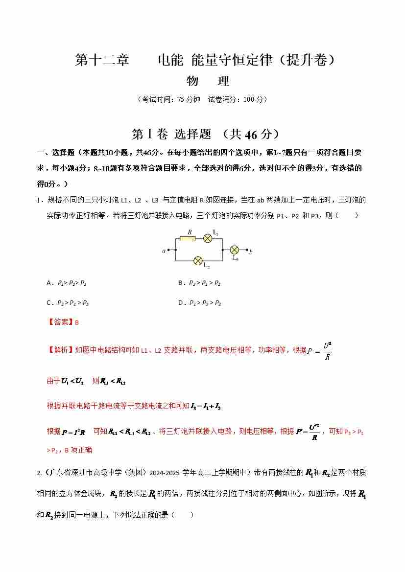 首页 > 全部 > 举一反三 > 第十二章 电能 能量守恒定律(举一反三单元测试·提升卷)(教师版)