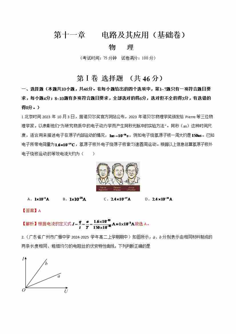 第十一章 电路及其应用(举一反三单元测试·基础卷)(教师版)
