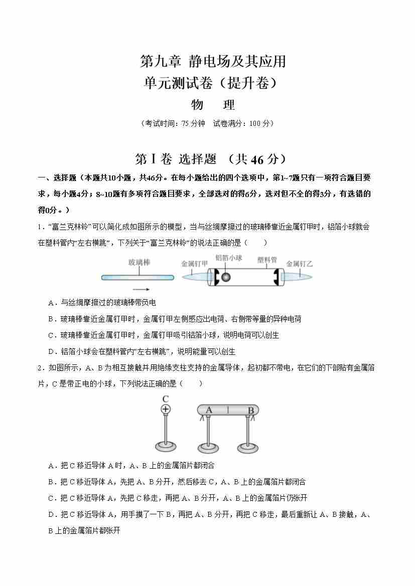 首页 > 全部 > 举一反三 > 第九章 静电场及其应用(单元测试·提升卷)(学生版)