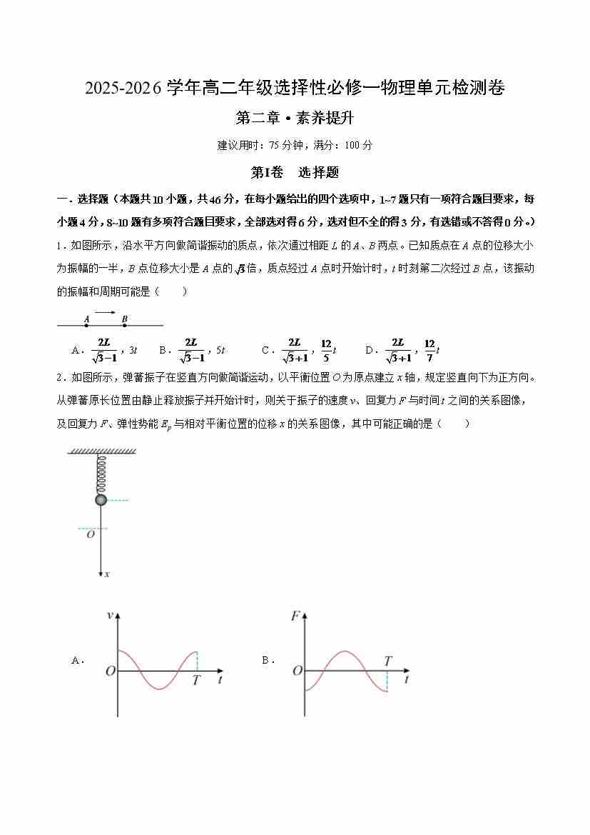 首页 > 全部 > 单元测试 > 第二章 机械振动(单元测试·提升卷)(考试版A4)