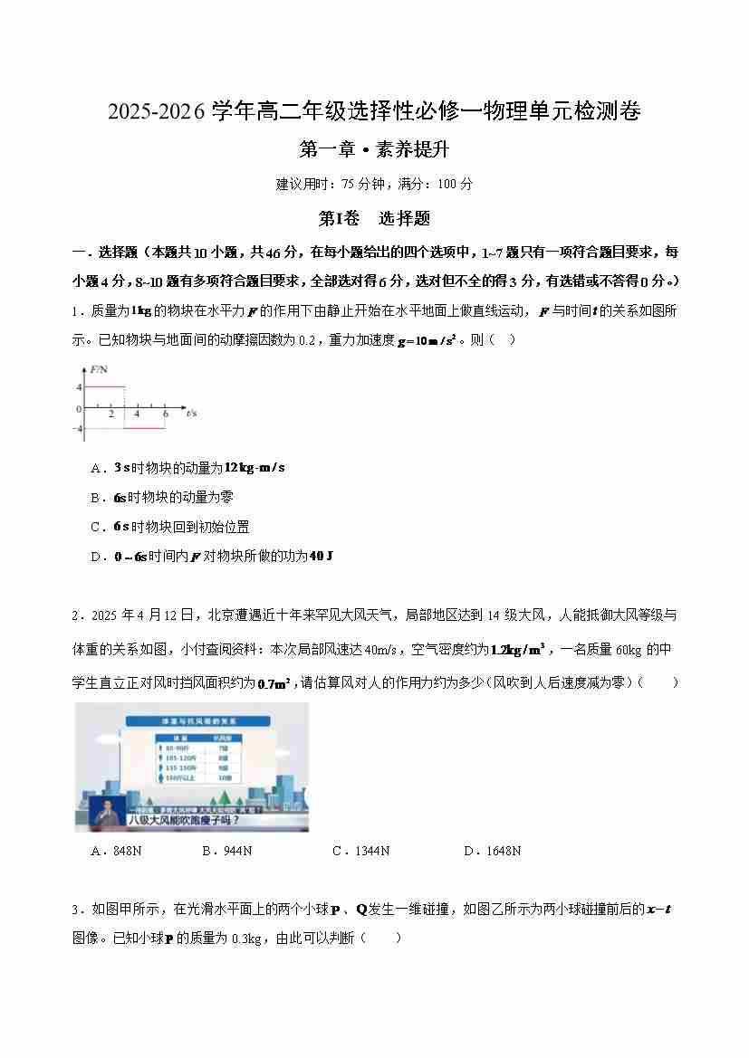 第一章 动量守恒定律(单元测试·提升卷)(考试版A4)