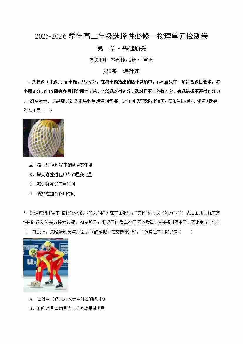 第一章 动量守恒定律(单元测试·基础卷)(考试版A4)