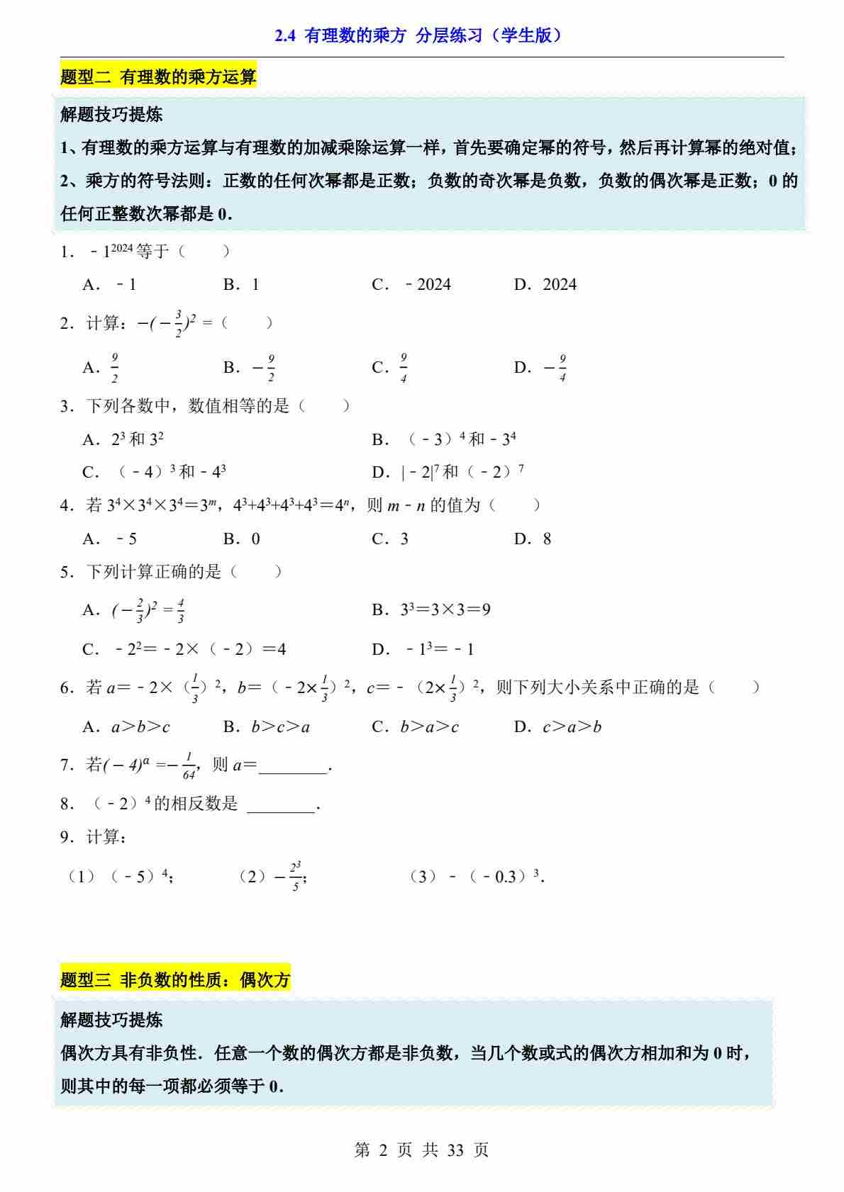 2.4 有理数的乘方(分层练习)