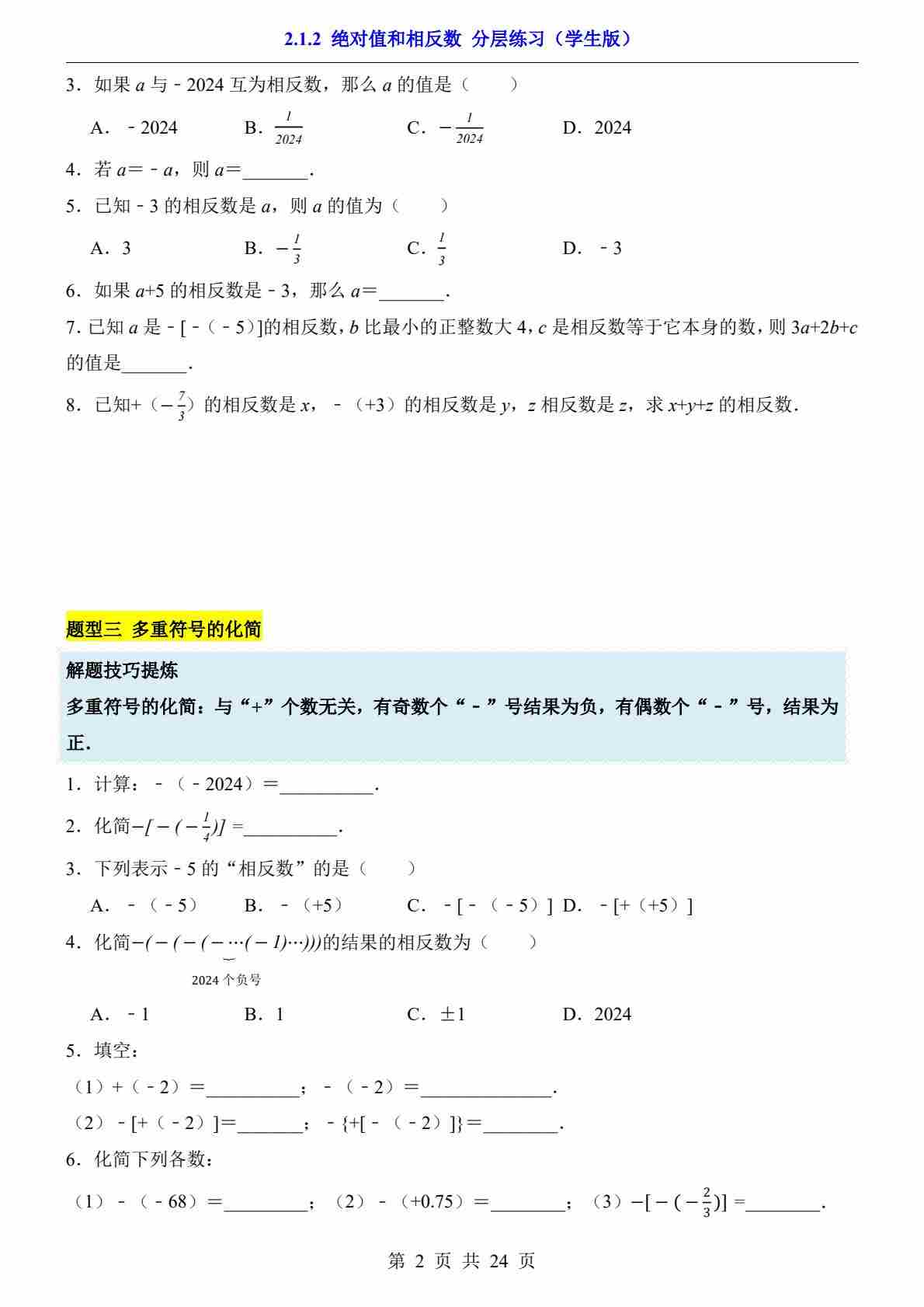 首页 > 全部 > 一课一练 > 2.1.2 绝对值和相反数(分层练习)