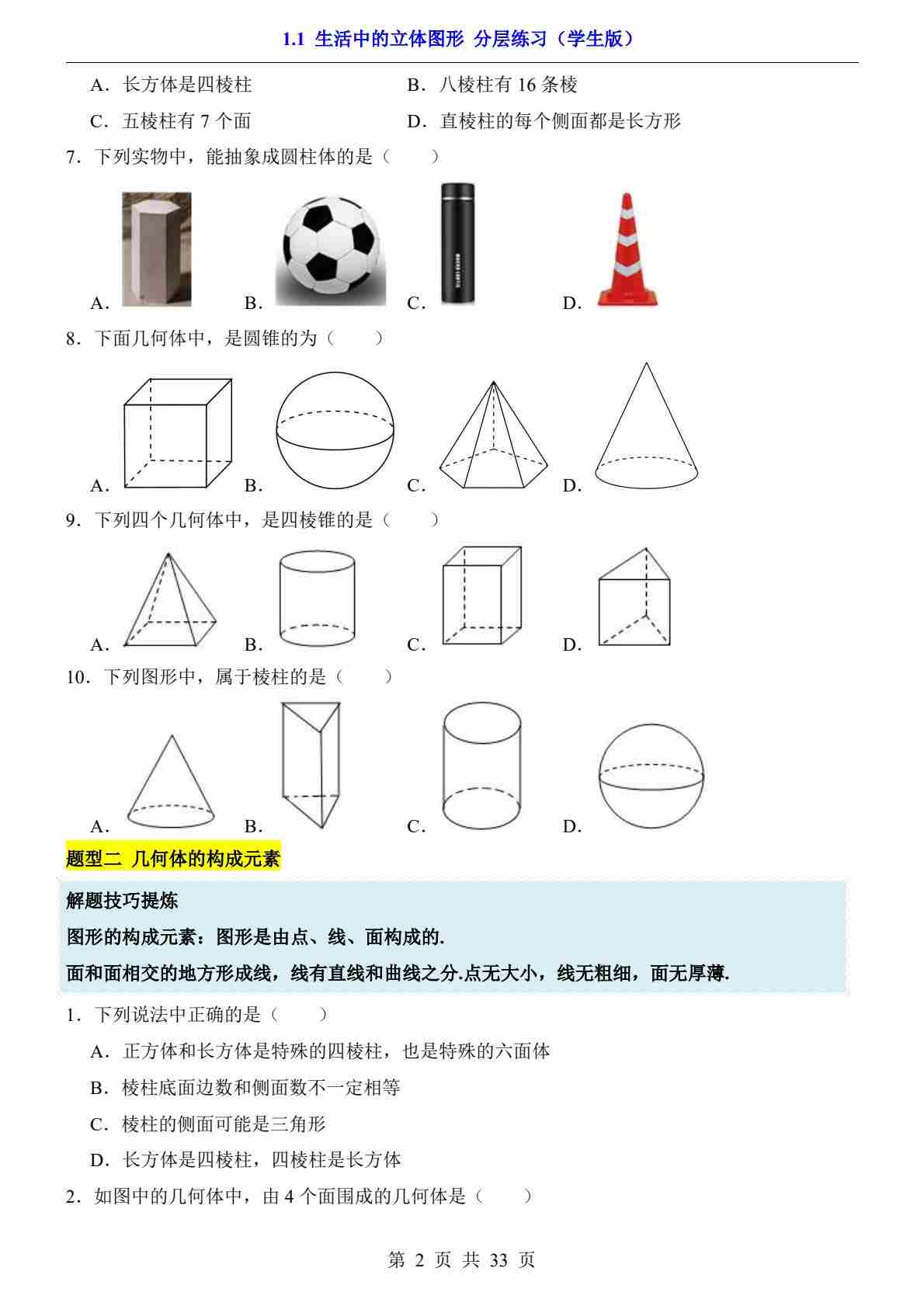 首页 > 全部 > 一课一练 > 1.1 生活中的立体图形(分层练习)