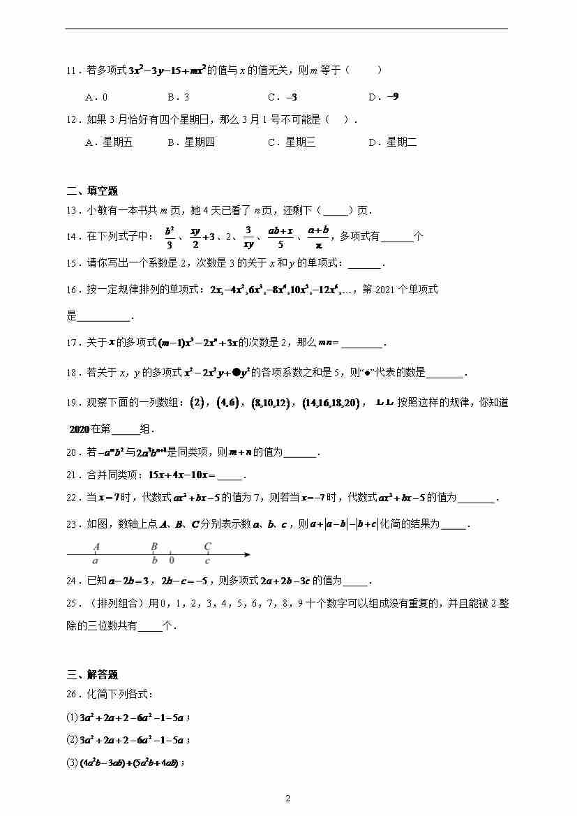 首页 > 全部 > 章节练习 > 第3章 整式及其加减 章节训练(含答案) 2024-2025学年七年级数学上册 北师大版2024