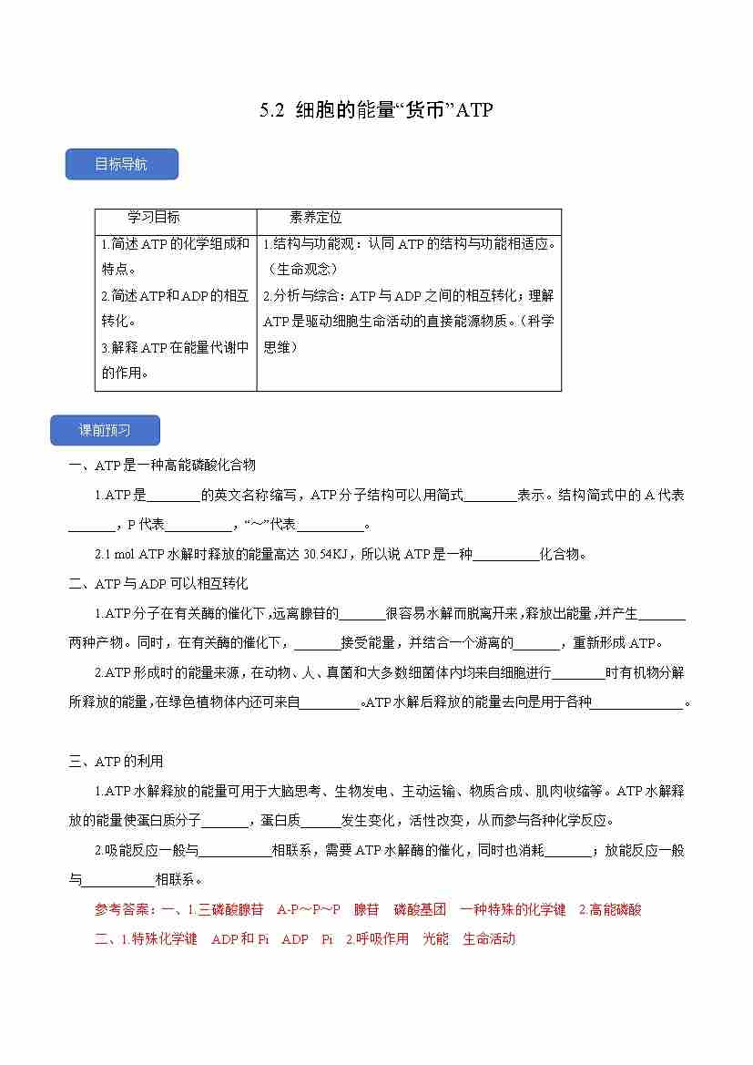 5.2 细胞的能量“货币”ATP人教版必修1)学生版