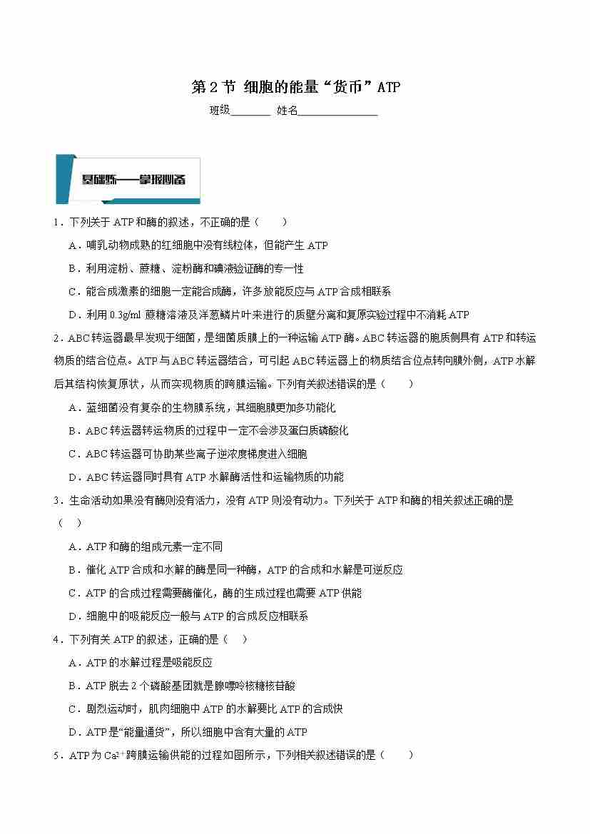 首页 > 全部 > 分层作业 > 5.2 细胞的能量“货币”ATP(原卷版)