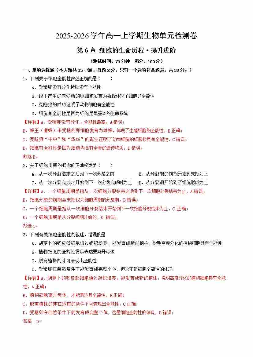 首页 > 全部 > 单元试卷 > 第6章 细胞的生命历程(单元测试·提升卷)(教师版)