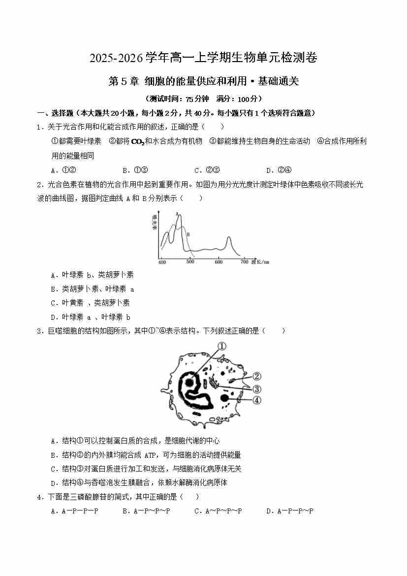 首页 > 全部 > 单元试卷 > 第5章 细胞的能量供应和利用(单元测试·基础卷)(考试版A4)
