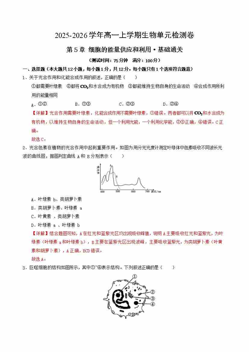 首页 > 全部 > 单元试卷 > 第5章 细胞的能量供应和利用(单元测试·基础卷)(教师版)