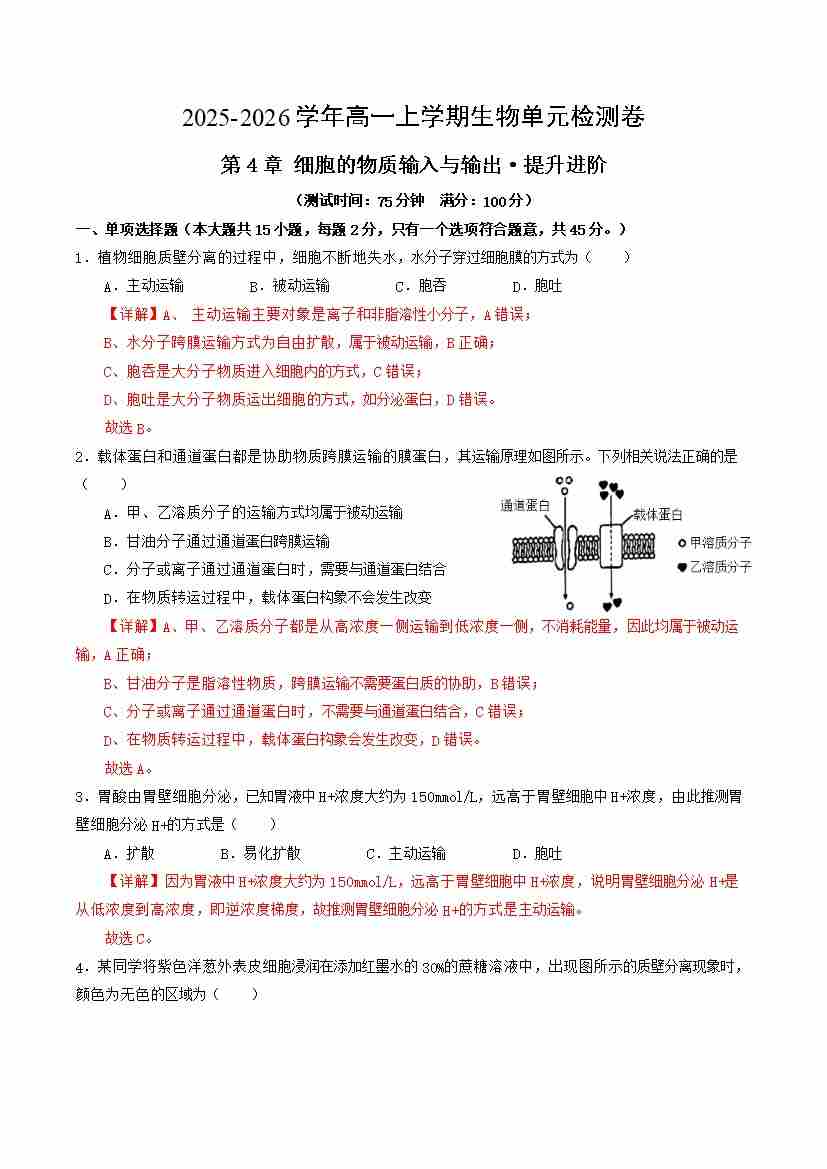 首页 > 全部 > 单元试卷 > 第4章 细胞的物质输入与输出(单元测试·提升卷)(教师版)