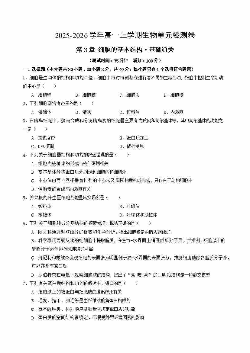 第3章 细胞的基本结构(单元测试·基础卷)(考试版A4)