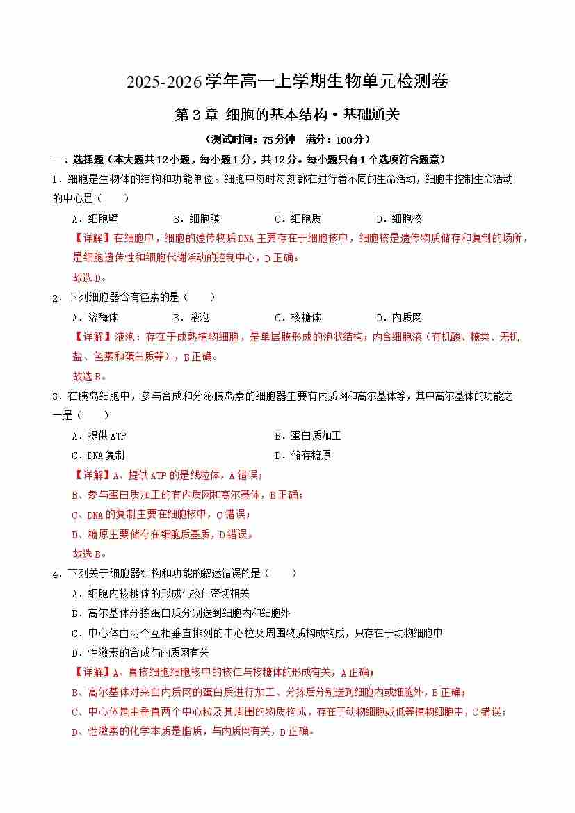 首页 > 全部 > 单元试卷 > 第3章 细胞的基本结构(单元测试·基础卷)(教师版)