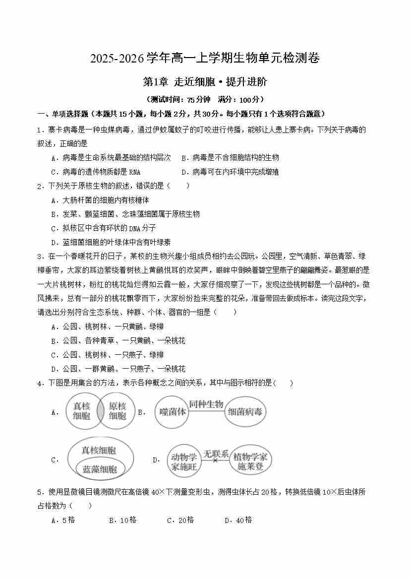 首页 > 全部 > 单元试卷 > 第1章 走近细胞(单元测试·提升卷)(考试版A4)