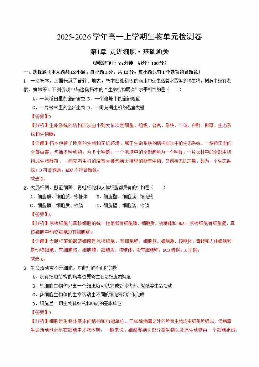 首页 > 全部 > 单元试卷 > 第1章 走近细胞(单元测试·基础卷)(教师版)