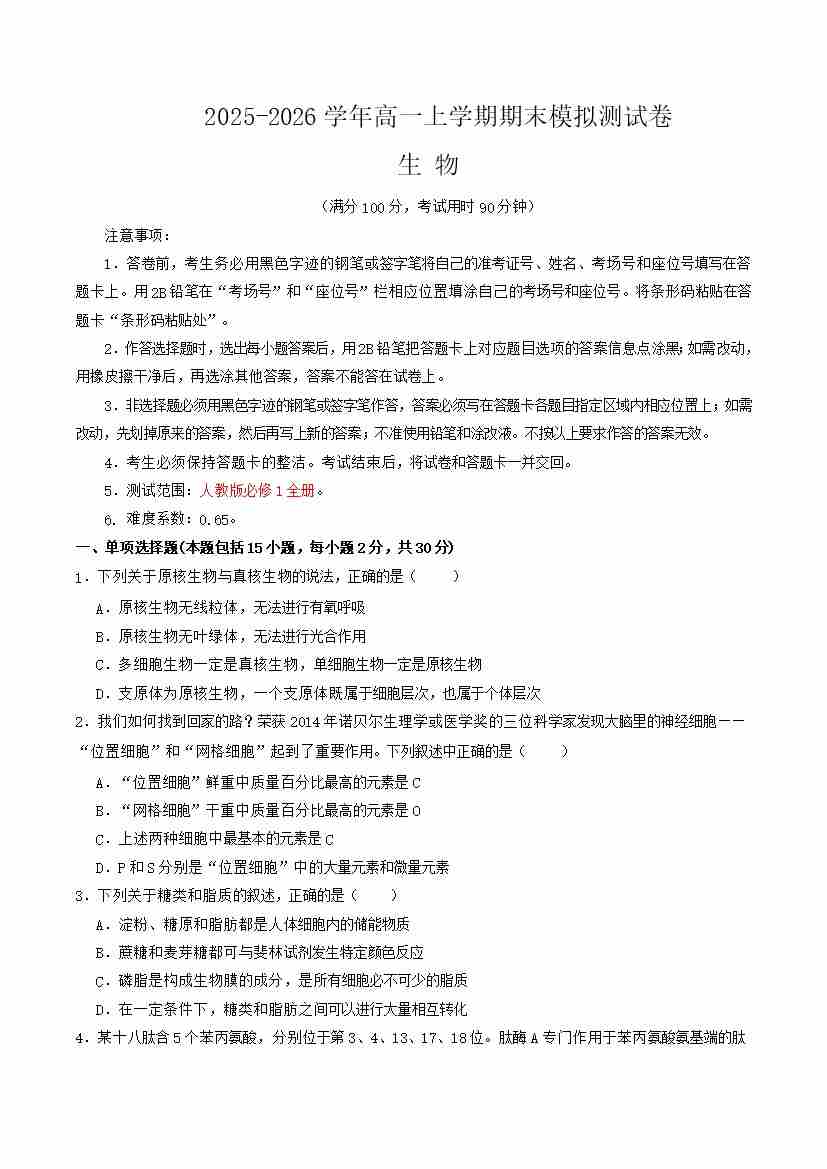 首页 > 全部 > 期末试卷 > 高一生物上学期期末模拟卷·培优卷(人教版)(考试版A4)