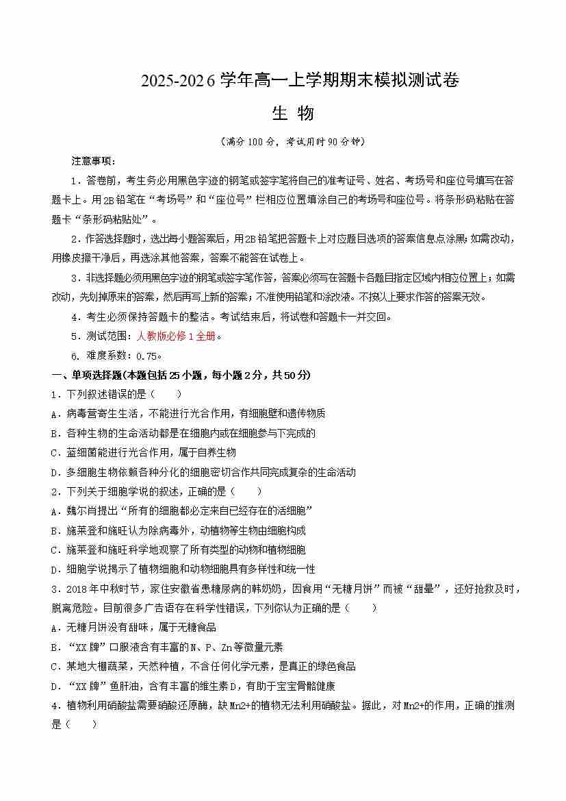 高一生物上学期期末模拟卷·基础卷(人教版)(考试版A4)