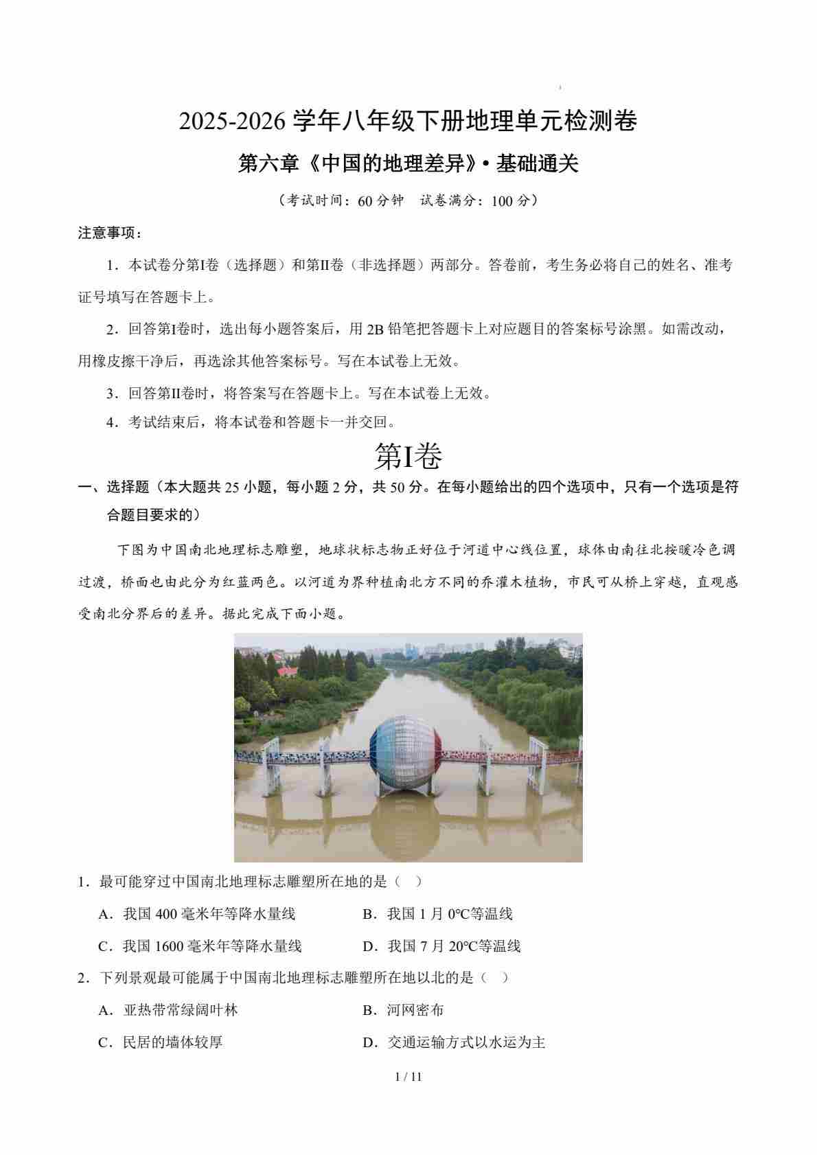 八下地理第六章测试·基础卷(考试版A4)