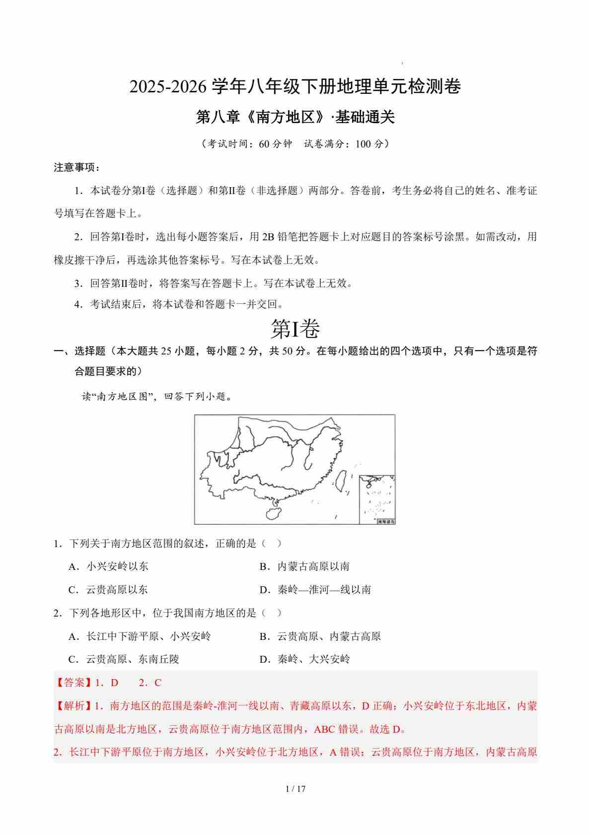 首页 > 全部 > 单元基础卷 > 八下地理第八章测试·基础卷(解析版)