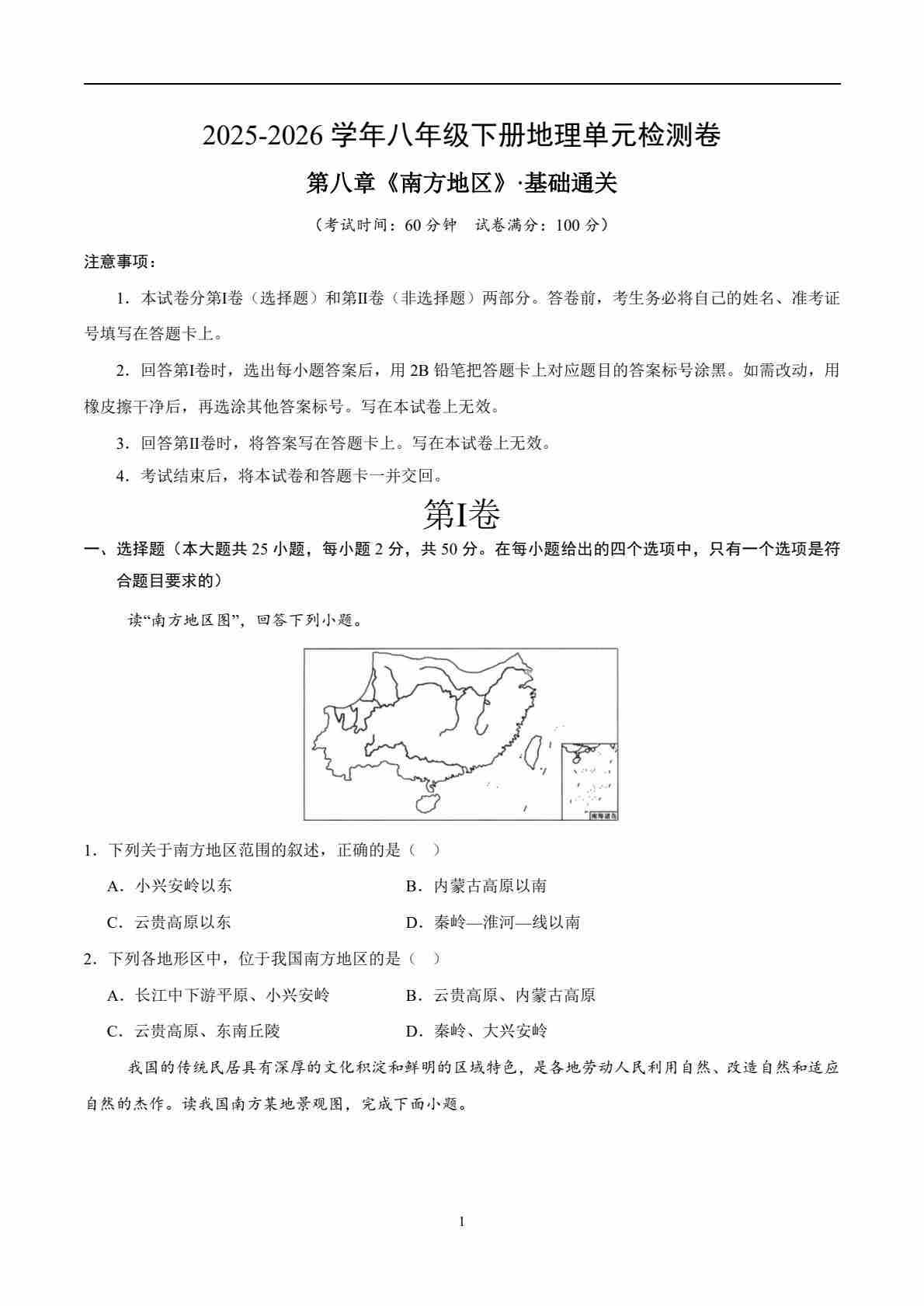 首页 > 全部 > 单元基础卷 > 八下地理第八章测试·基础卷(考试版A4)