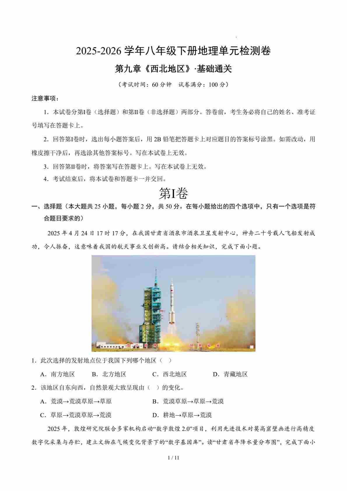首页 > 全部 > 单元基础卷 > 八下地理第九章测试·基础卷(考试版A4)