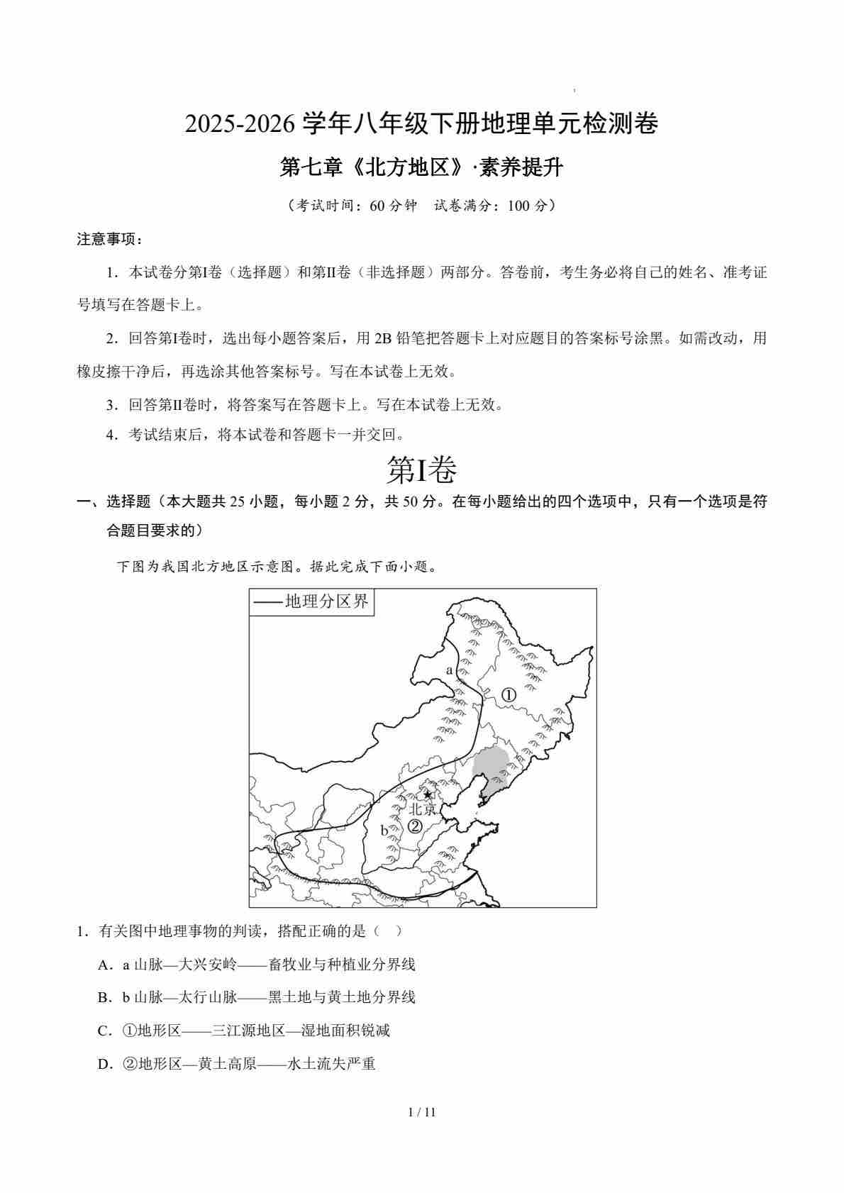 首页 > 全部 > 单元提升卷 > 八下地理第七章测试·提升卷(考试版A4)