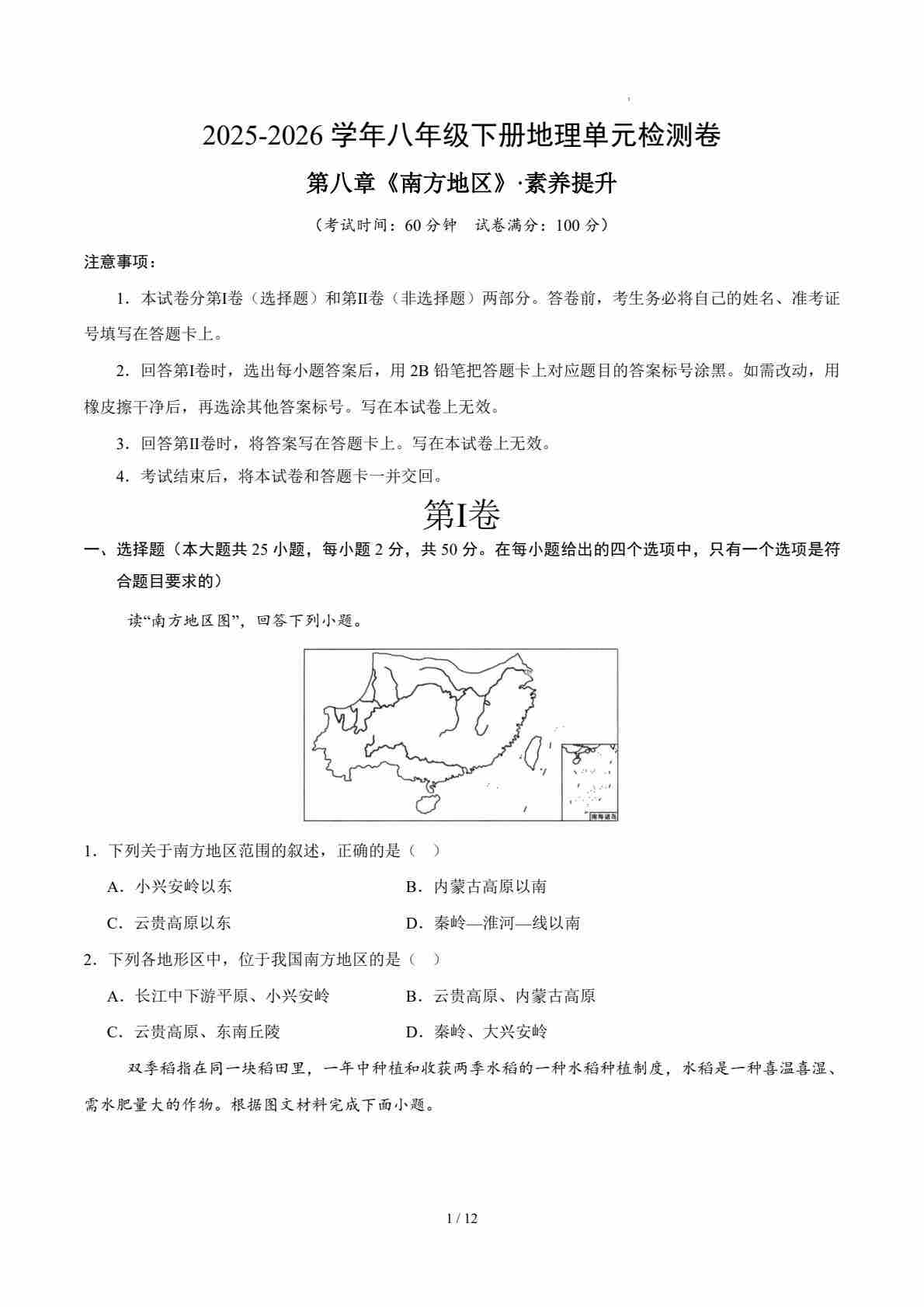 首页 > 全部 > 单元提升卷 > 八下地理第八章测试·提升卷(考试版A4)