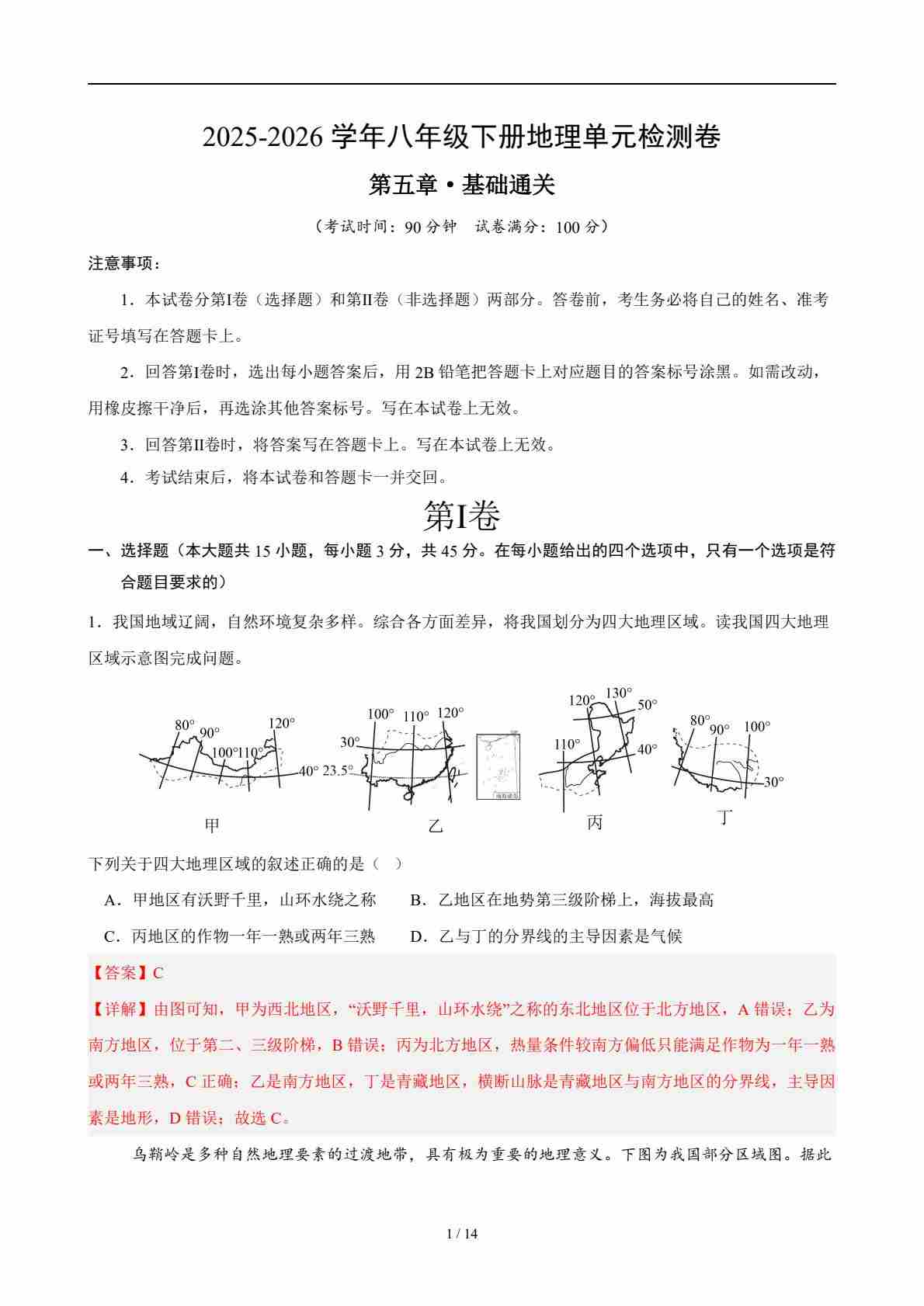 首页 > 全部 > 单元基础卷 > 八年级下册地理 第五章 中国的地域差异 测试·基础卷(解析版)