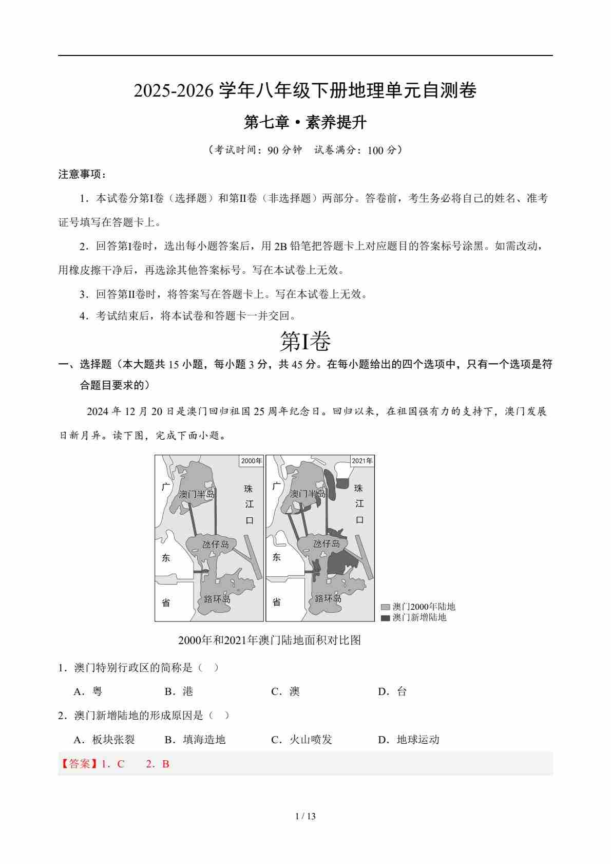 首页 > 全部 > 单元提升卷 > 八年级下册地理 第七章 区域内外联系与协同发展 自测·提升卷(解析版)