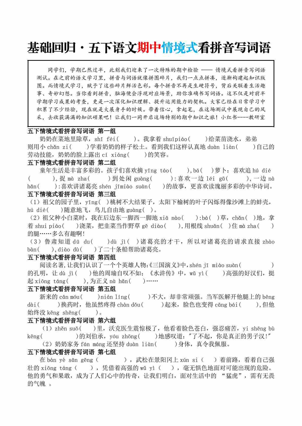 【基础回归•期中情境式看拼音写词语】五下语文