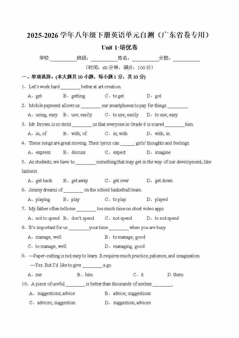首页 > 全部 > 单元地区卷 > 八年级英语下册Unit 1 单元自测·广东省卷专用(考试版A4)