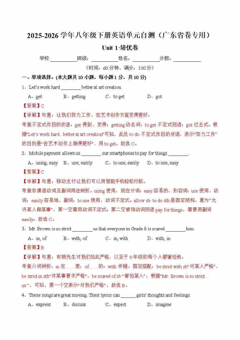 首页 > 全部 > 单元地区卷 > 八年级英语下册Unit 1 单元自测·广东省卷专用(解析版)