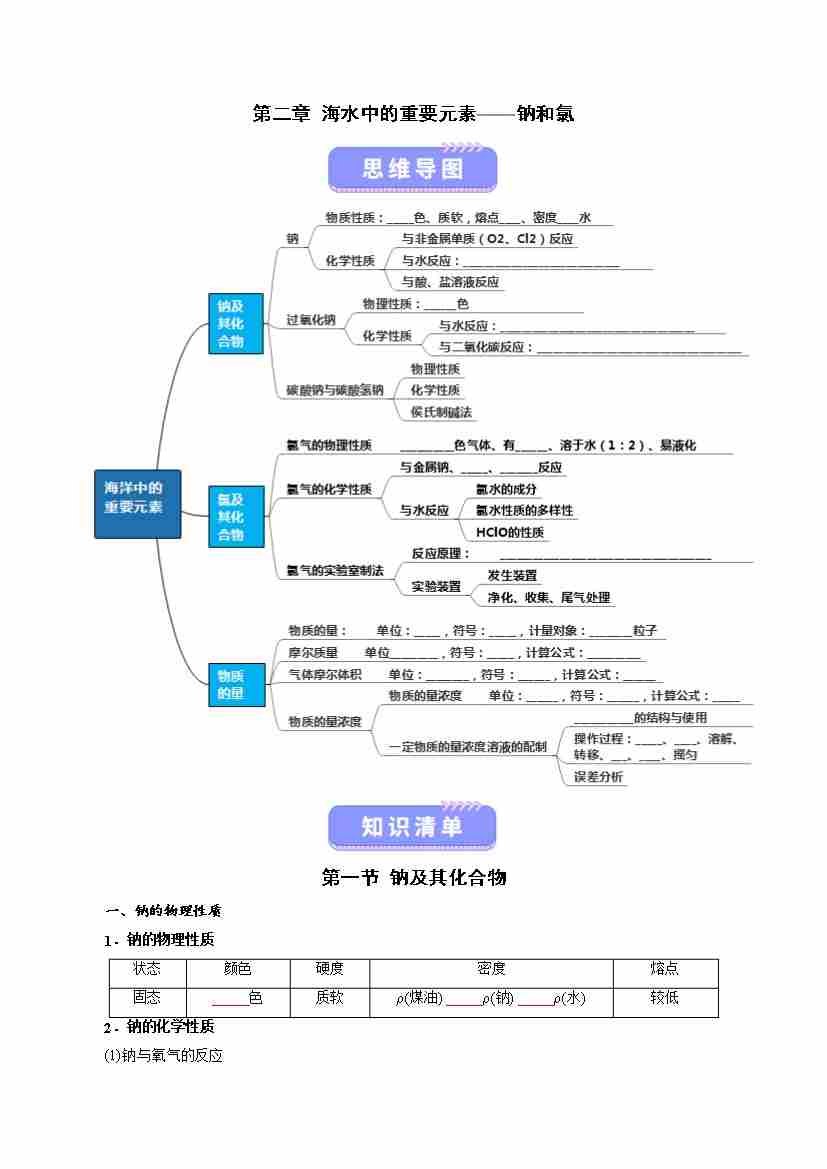 首页 > 全部 > 知识清单 > 第二章 海水中的重要元素——钠和氯(知识清单)(学生版)