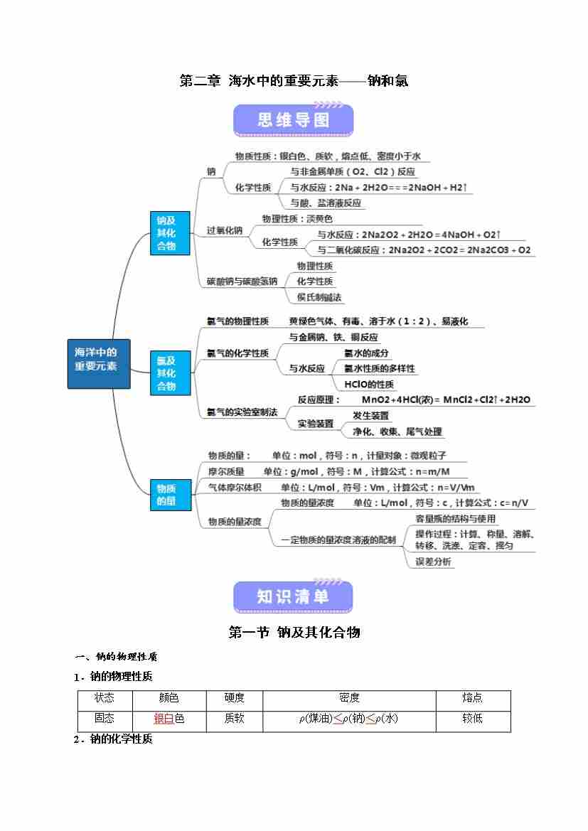 首页 > 全部 > 知识清单 > 第二章 海水中的重要元素——钠和氯(知识清单)(教师版)