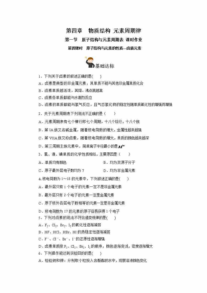 首页 > 全部 > 分层作业 > 4.1.4 原子结构与元素的性质—卤素(分层作业)-(人教版2019必修第一册)(原卷版)
