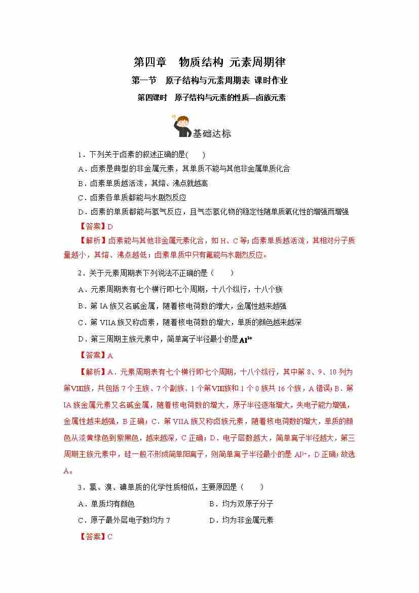 4.1.4 原子结构与元素的性质—卤素(分层作业)-(人教版2019必修第一册)(解析版)