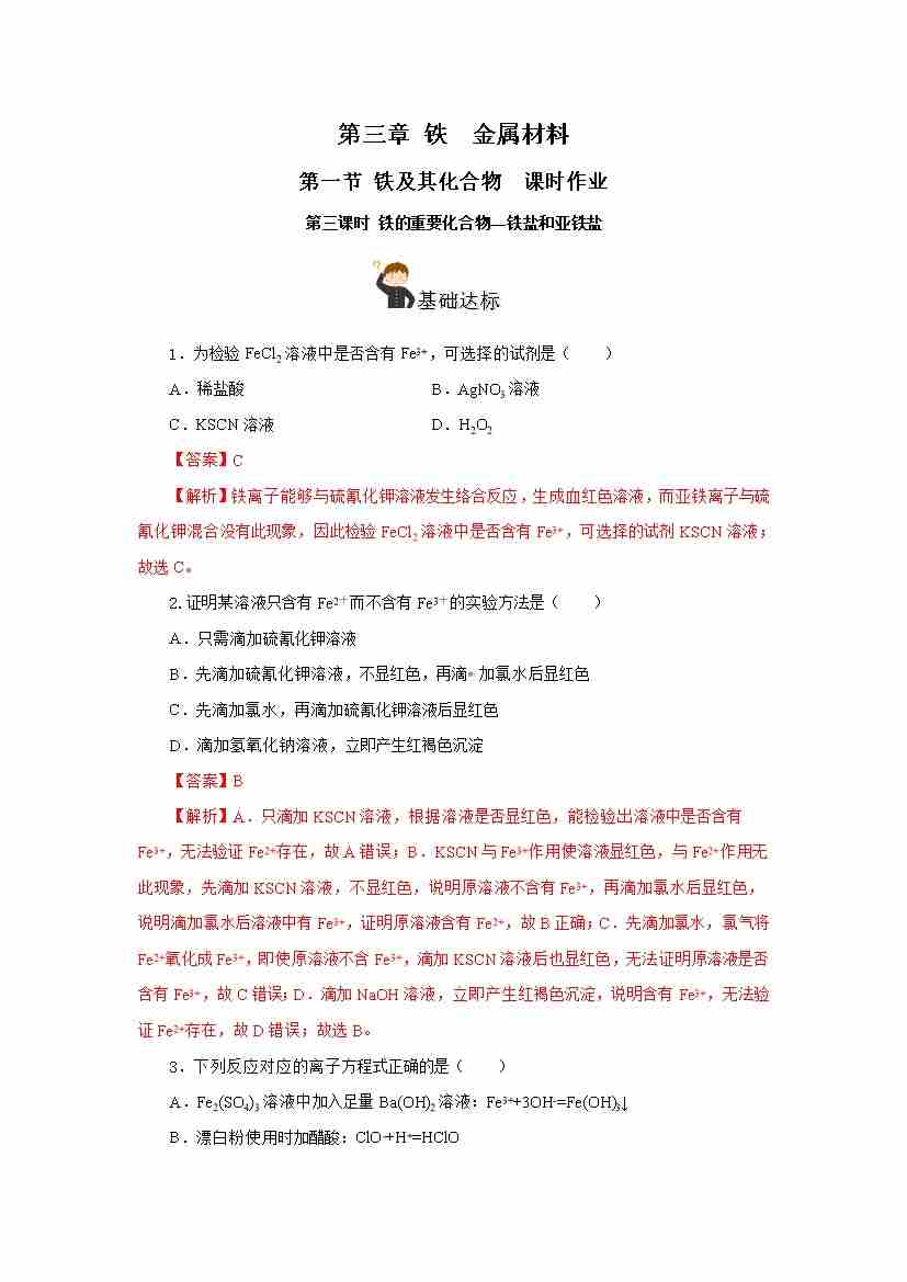 首页 > 全部 > 分层作业 > 3.1.3 铁的重要化合物—铁盐和亚铁盐(分层作业)-(人教版2019必修第一册)(解析版)
