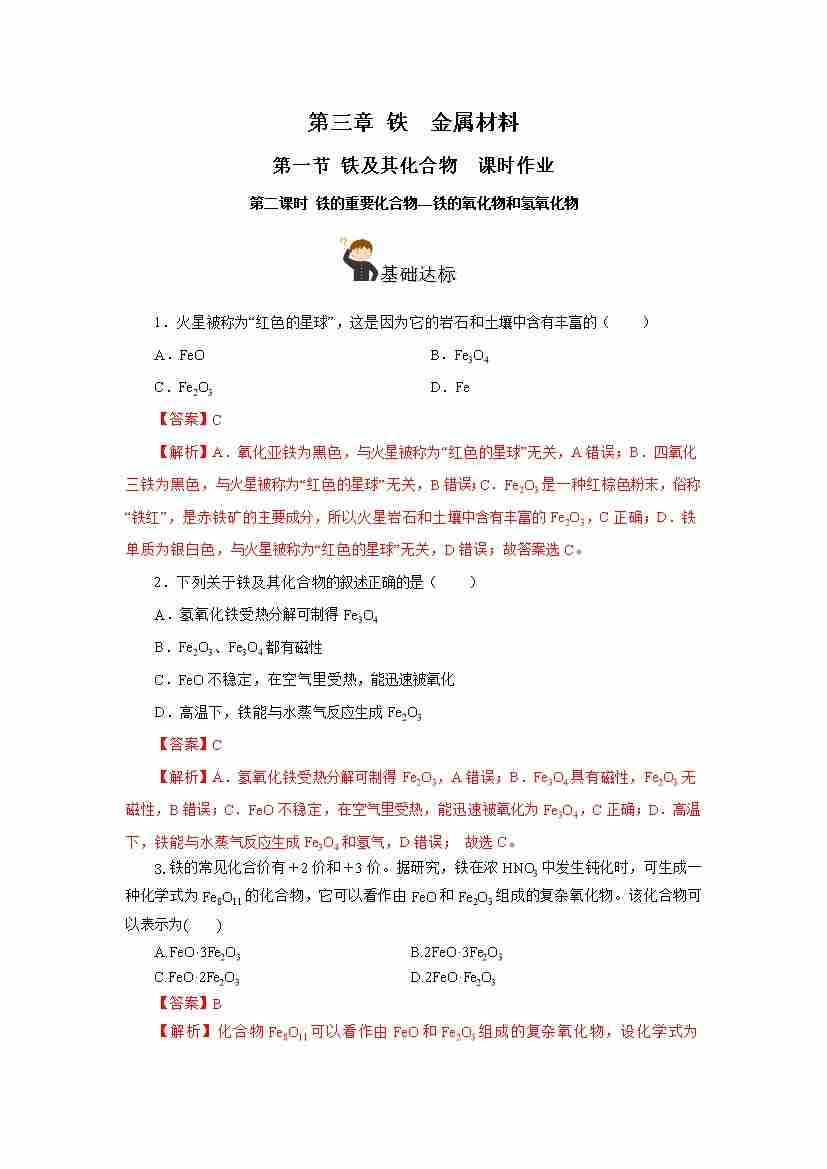 首页 > 全部 > 分层作业 > 3.1.2 铁的重要化合物—铁的氧化物和氢氧化物(分层作业)-(人教版2019必修第一册)(解析版)