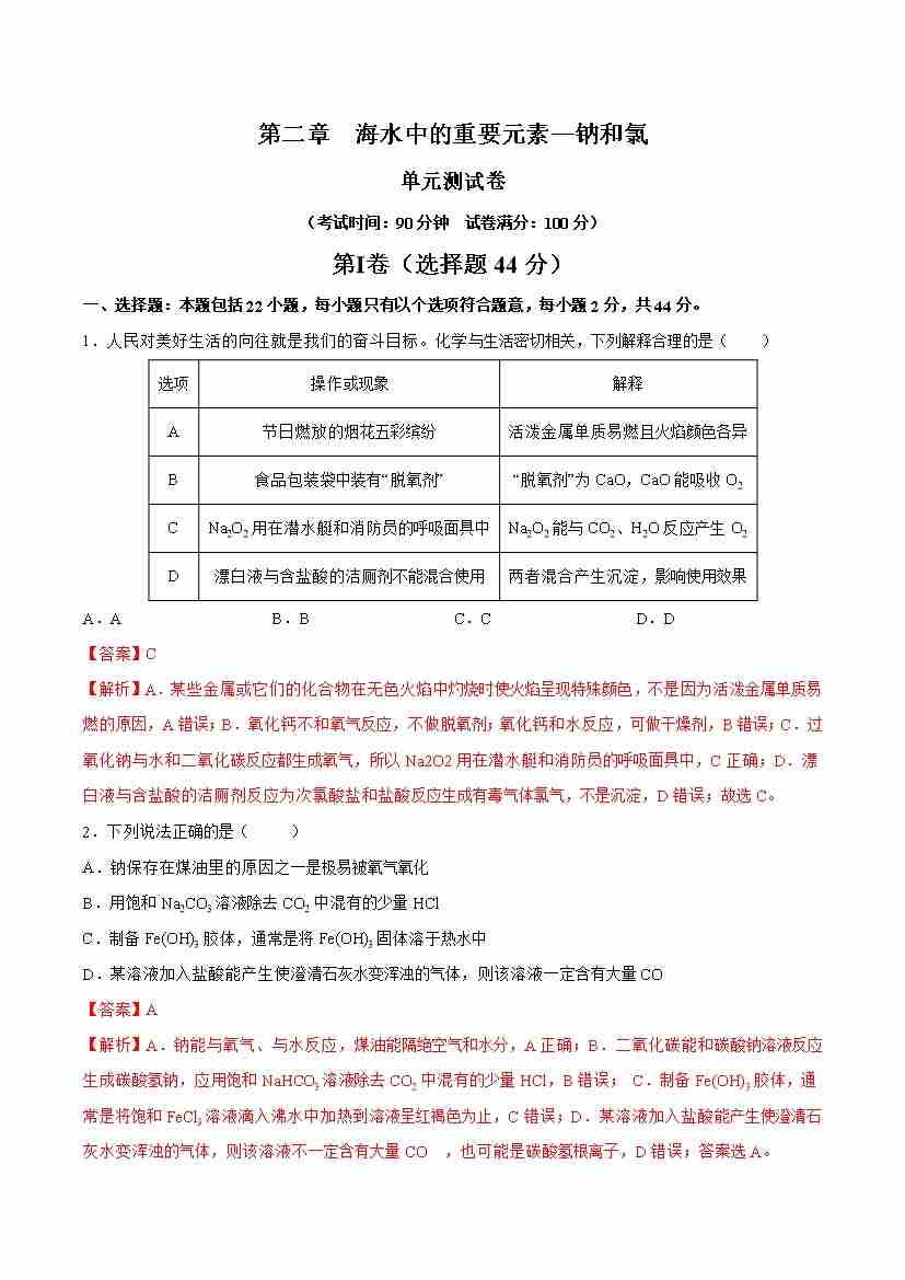 第二章 海水中的重要元素—钠和氯(单元测试)-(人教版2019必修第一册)(解析版)