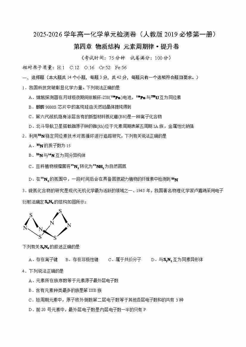 首页 > 全部 > 单元试卷 > 第四章 物质结构 元素周期律·提升卷(考试版A4)