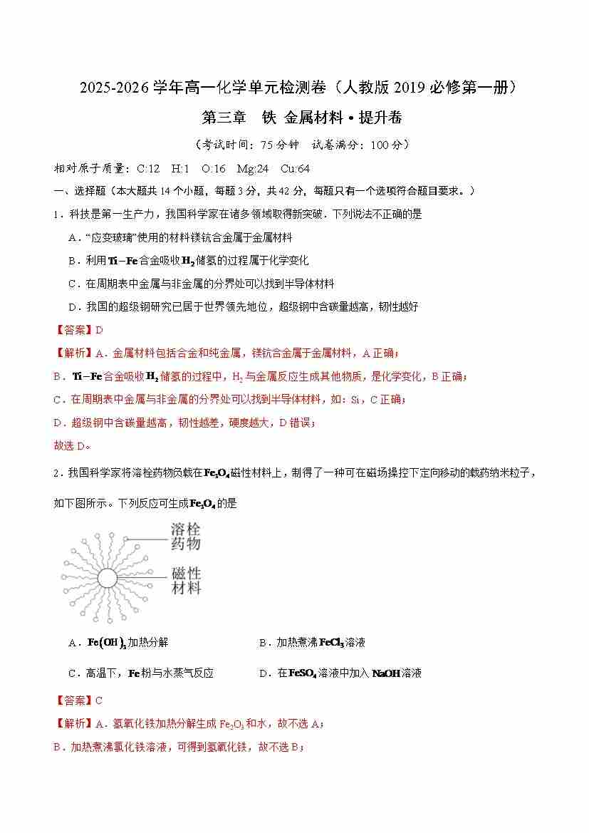 首页 > 全部 > 单元试卷 > 第三章 铁 金属材料·提升卷(人教版2019必修第一册)(教师版)