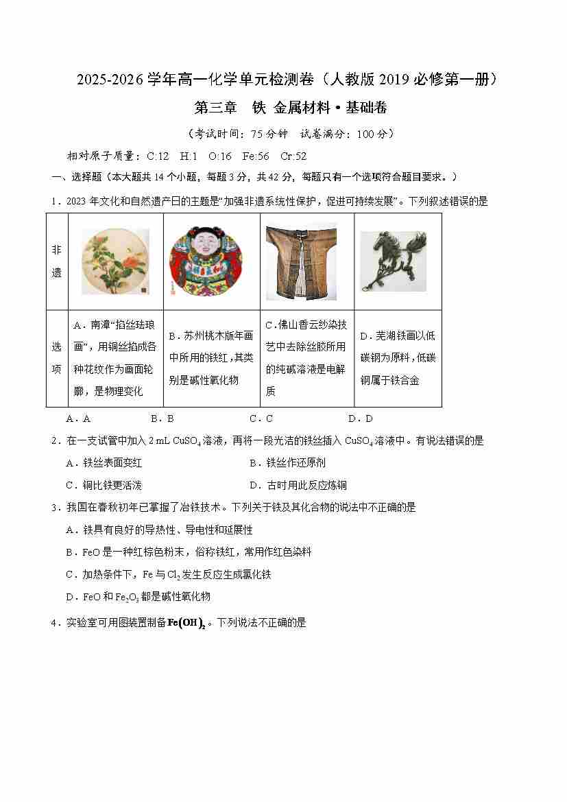 首页 > 全部 > 单元试卷 > 第三章 铁 金属材料·基础卷(人教版2019必修第一册)(考试版A4)