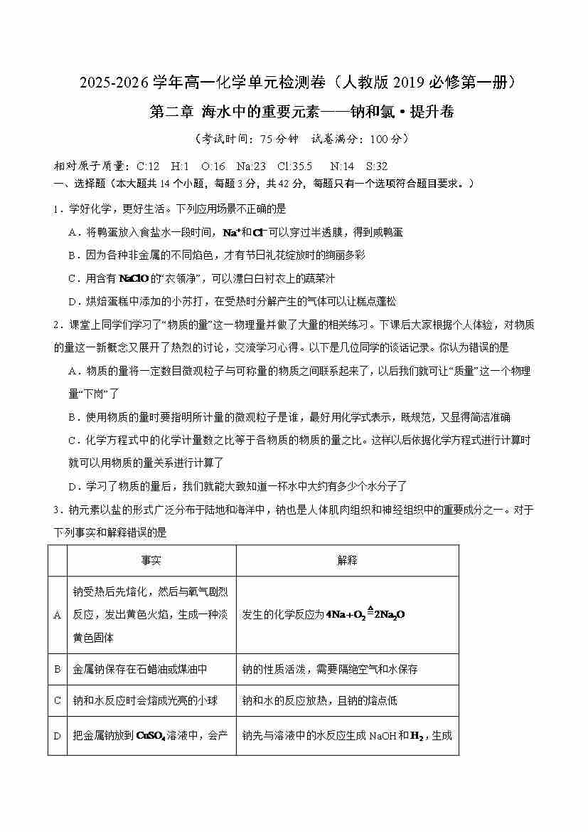第二章 海水中的重要元素——钠和氯·提升卷 (考试版A4)