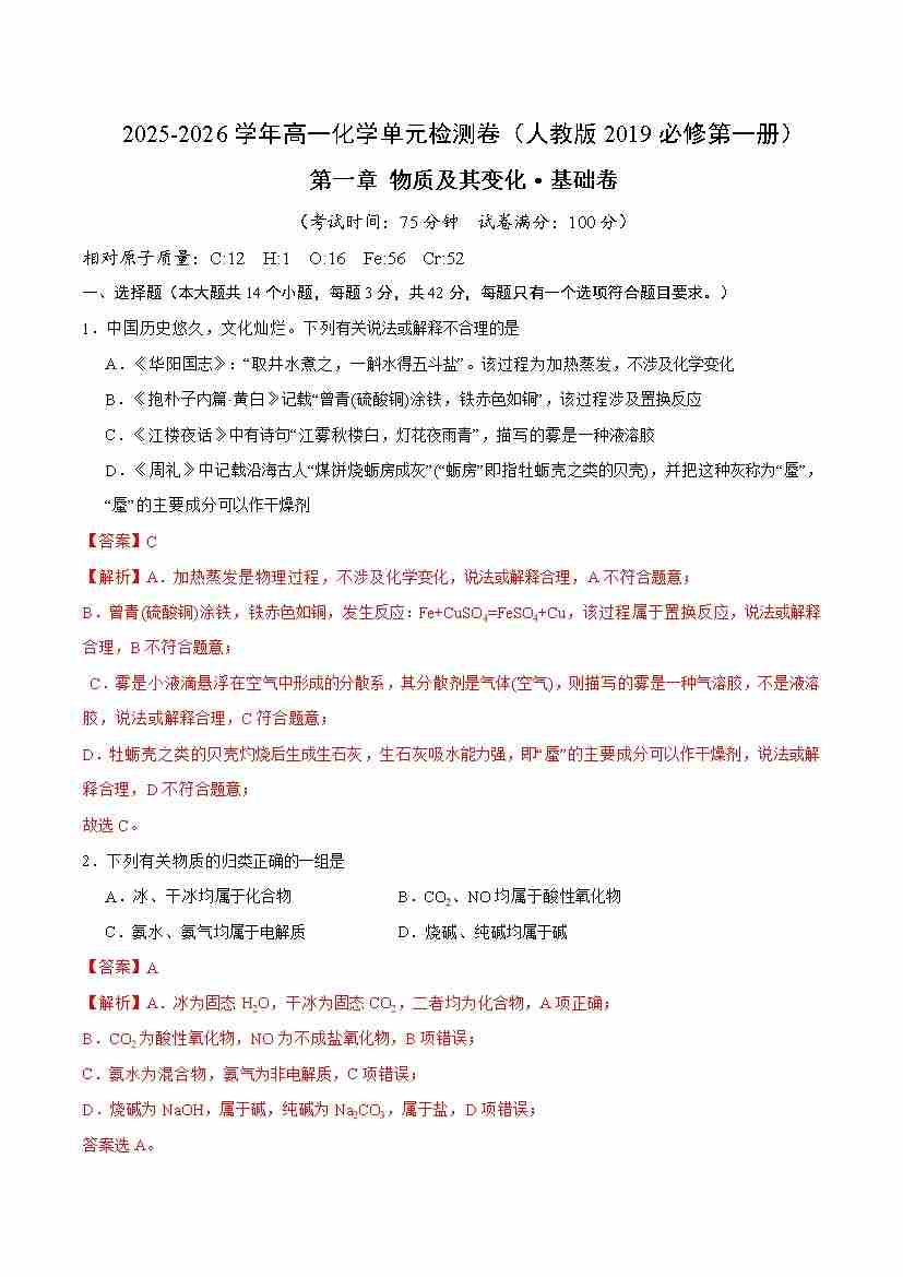 第一章 物质及其变化·基础卷(教师版)