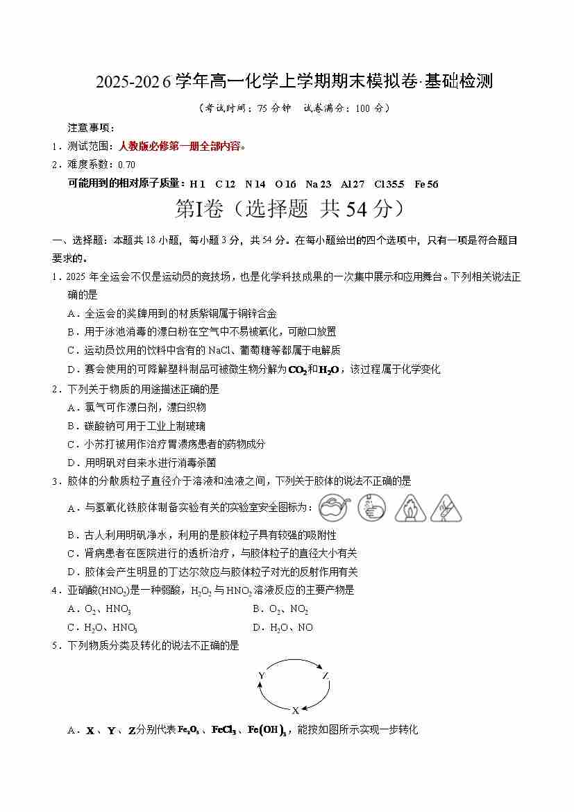 高一化学上学期期末模拟卷·基础检测(人教版)(考试版A4)