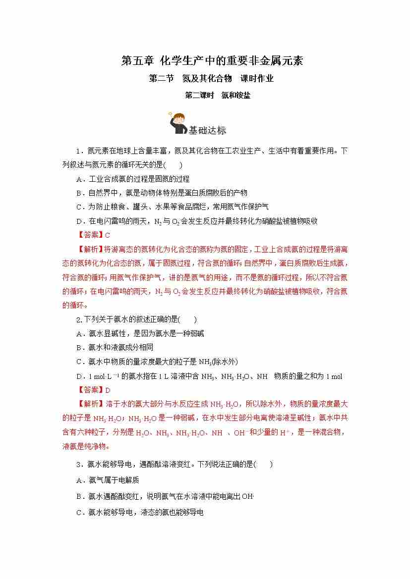首页 > 全部 > 分层作业 > 5.2.2 氮及其化合物—氨和铵盐(分层作业)-(人教版2019必修第二册)(解析版)