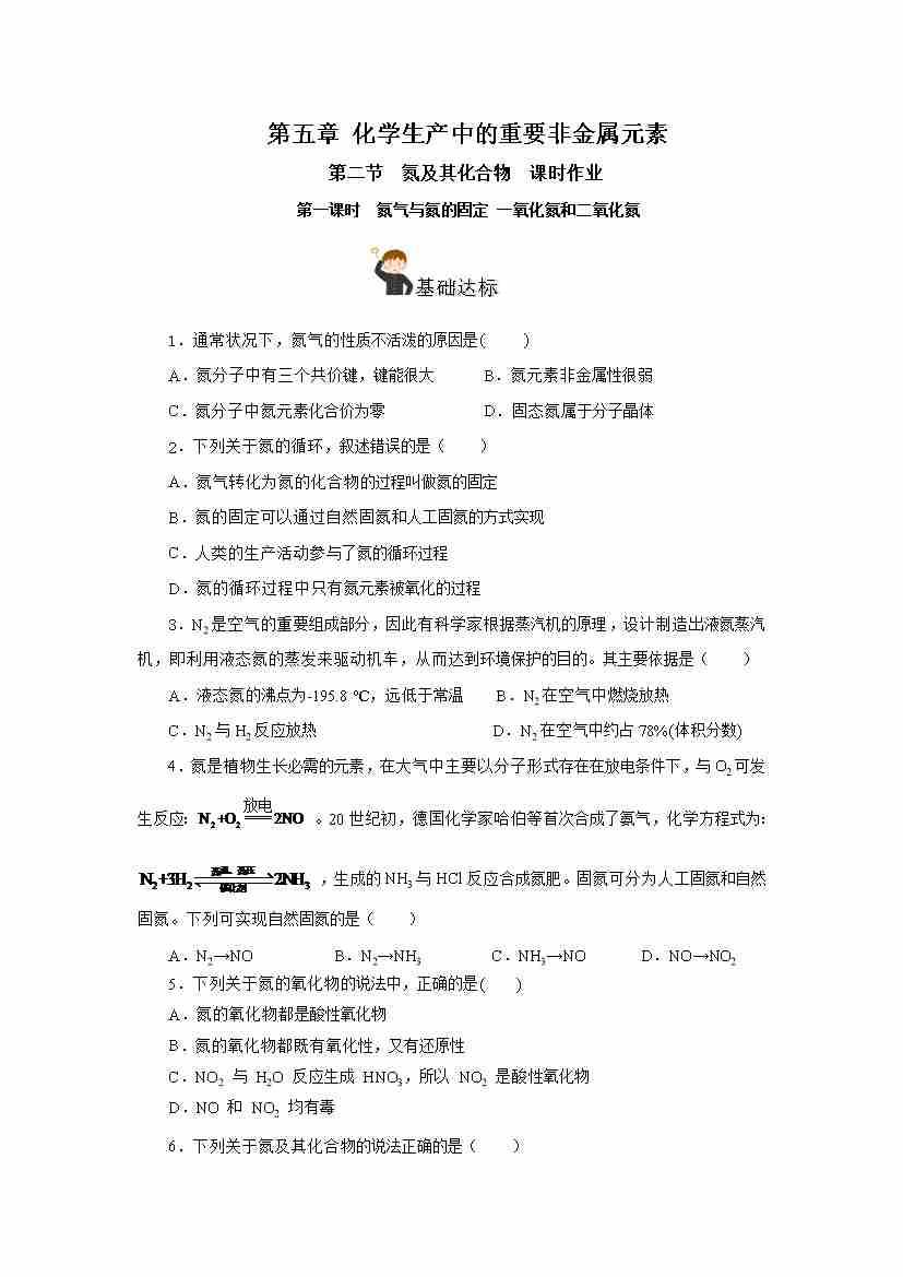 首页 > 全部 > 分层作业 > 5.2.1 氮及其化合物—氮气与氮的固定 一氧化氮和二氧化氮(分层作业)-(人教版2019必修第二册)(原卷版)