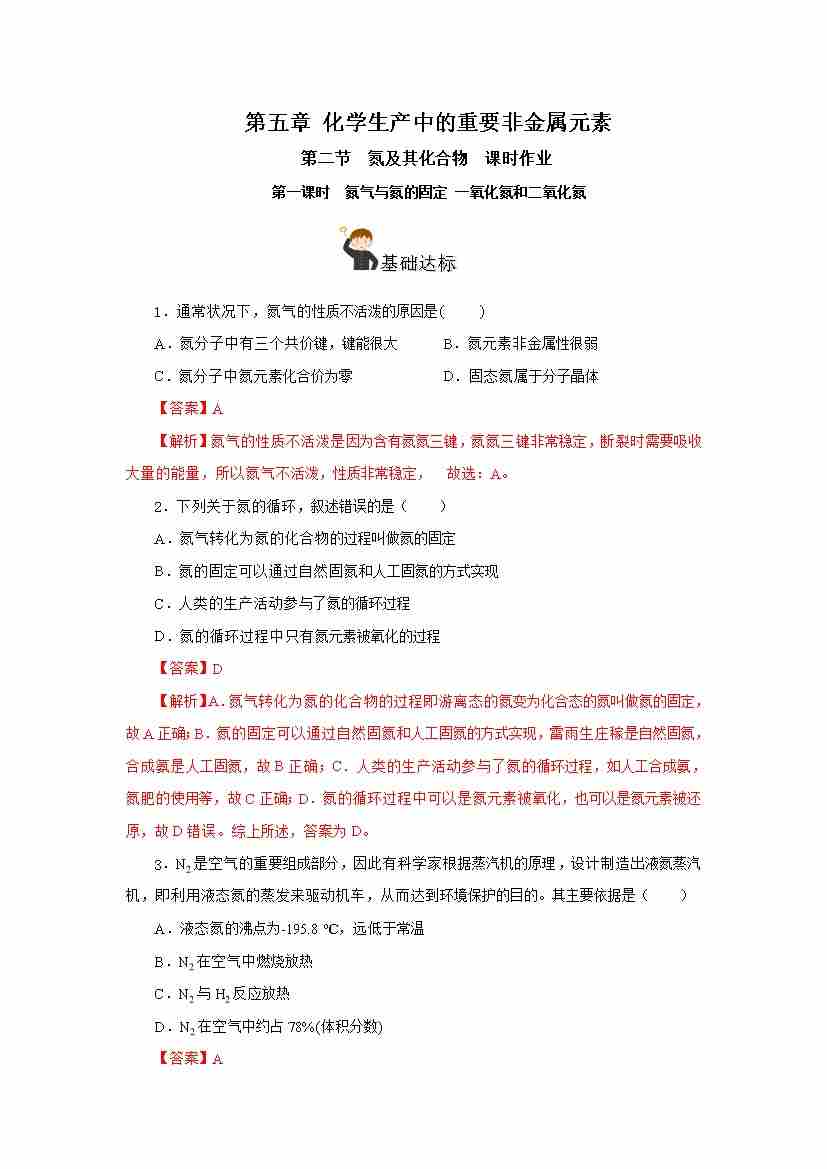 首页 > 全部 > 分层作业 > 5.2.1 氮及其化合物—氮气与氮的固定 一氧化氮和二氧化氮(分层作业)-(人教版2019必修第二册)(解析版)